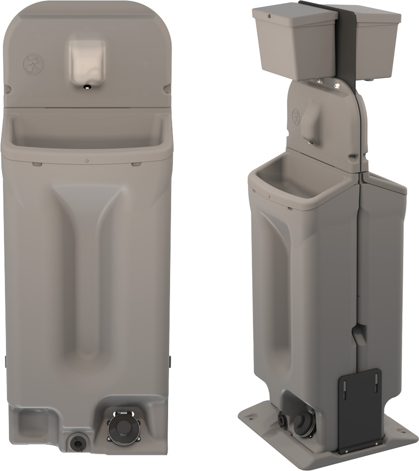 The Echo Single x2 combines two Echo Single units back to back, creating a free-standing hand wash station. One side holds freshwater while the other collects gray water, offering an economical two-bowl sink. Designed for easy transport, it fits into a standard restroom.